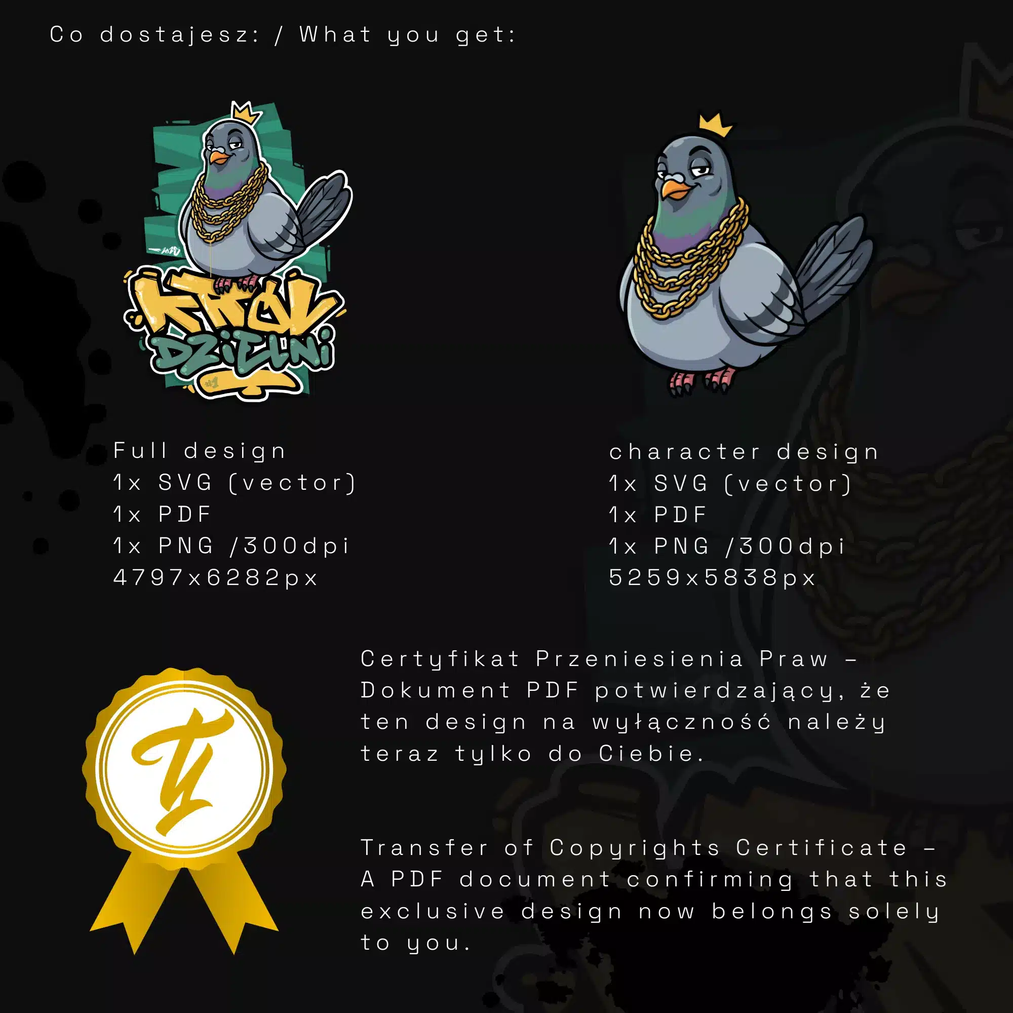 📜 Certyfikat Przeniesienia Praw – Dokument PDF w dwóch językach (polskim i angielskim), potwierdzający, że ten design na wyłączność należy teraz tylko do Ciebie.