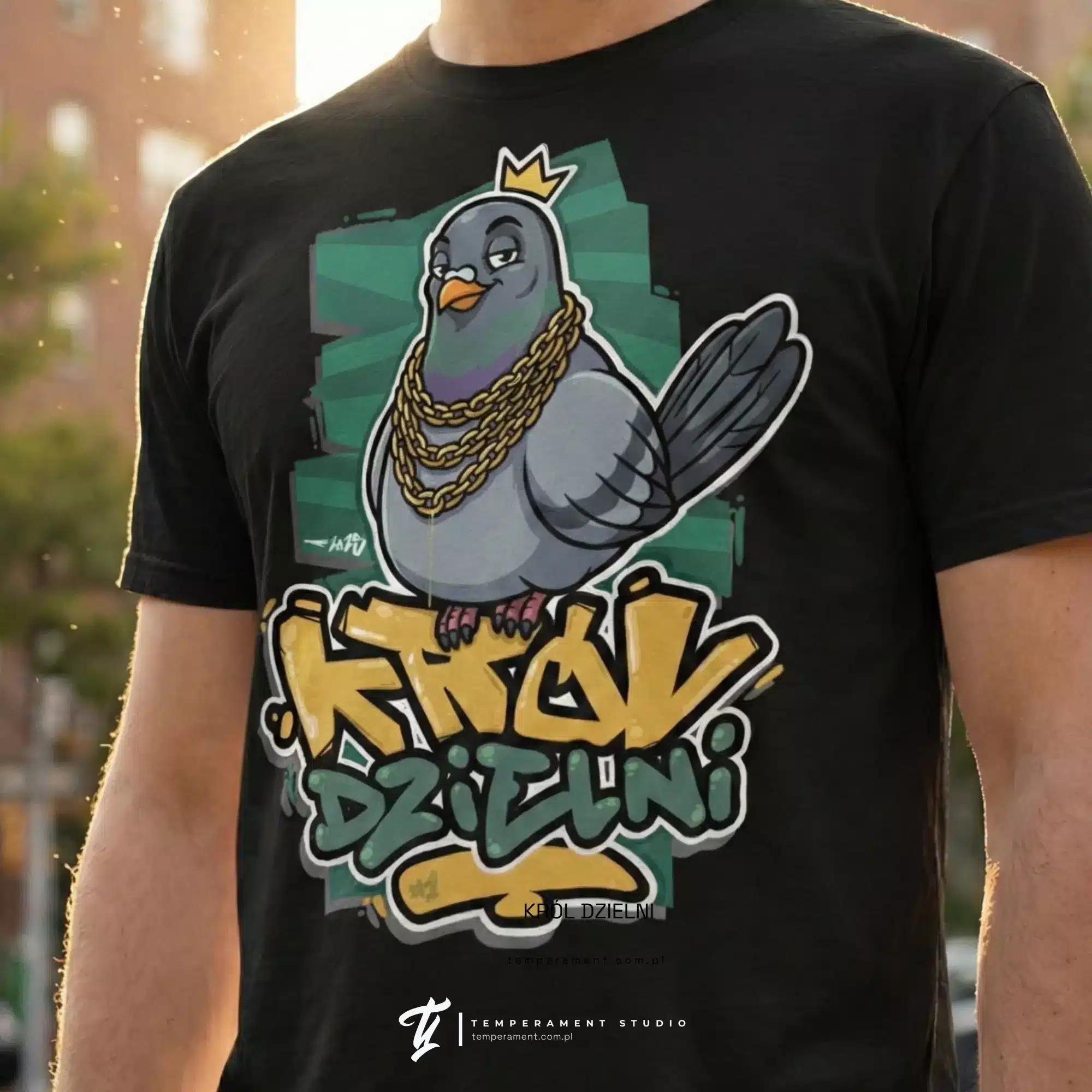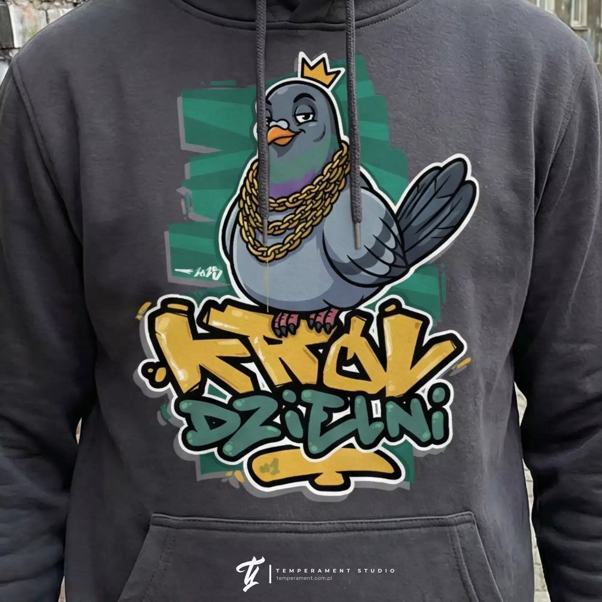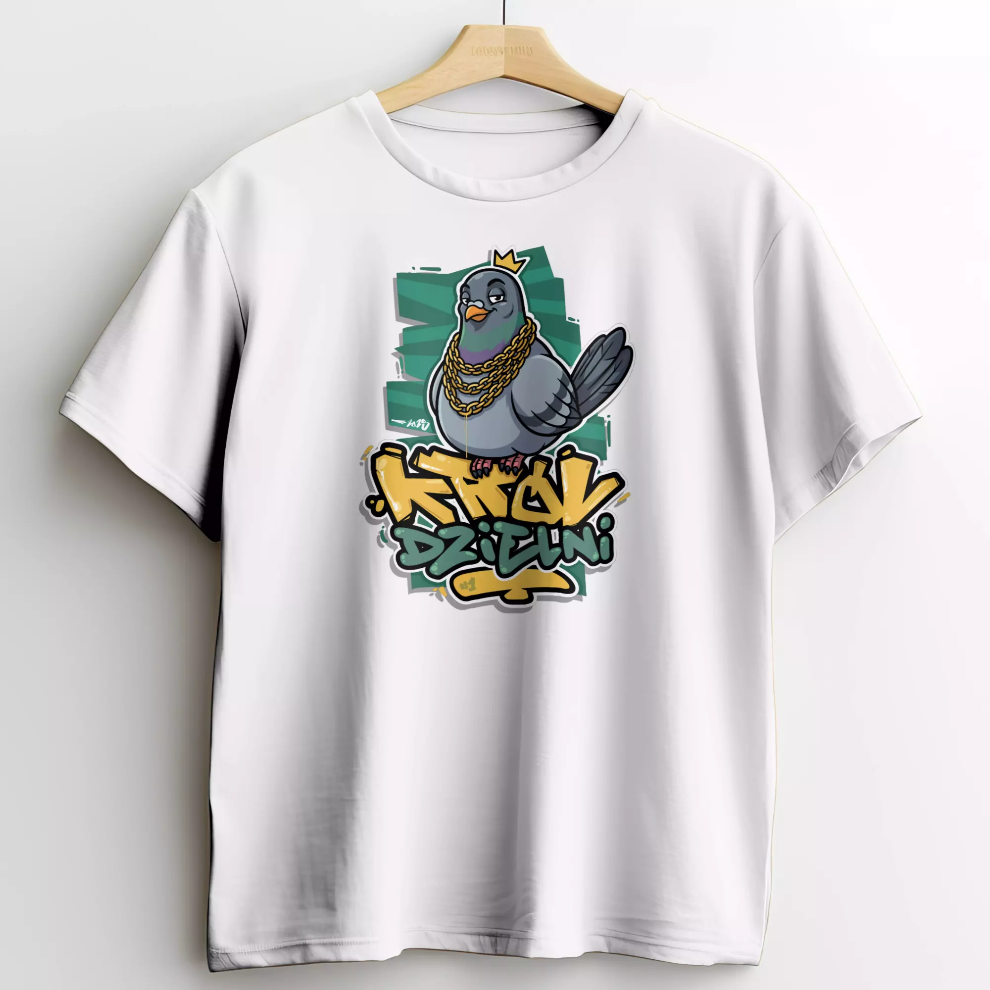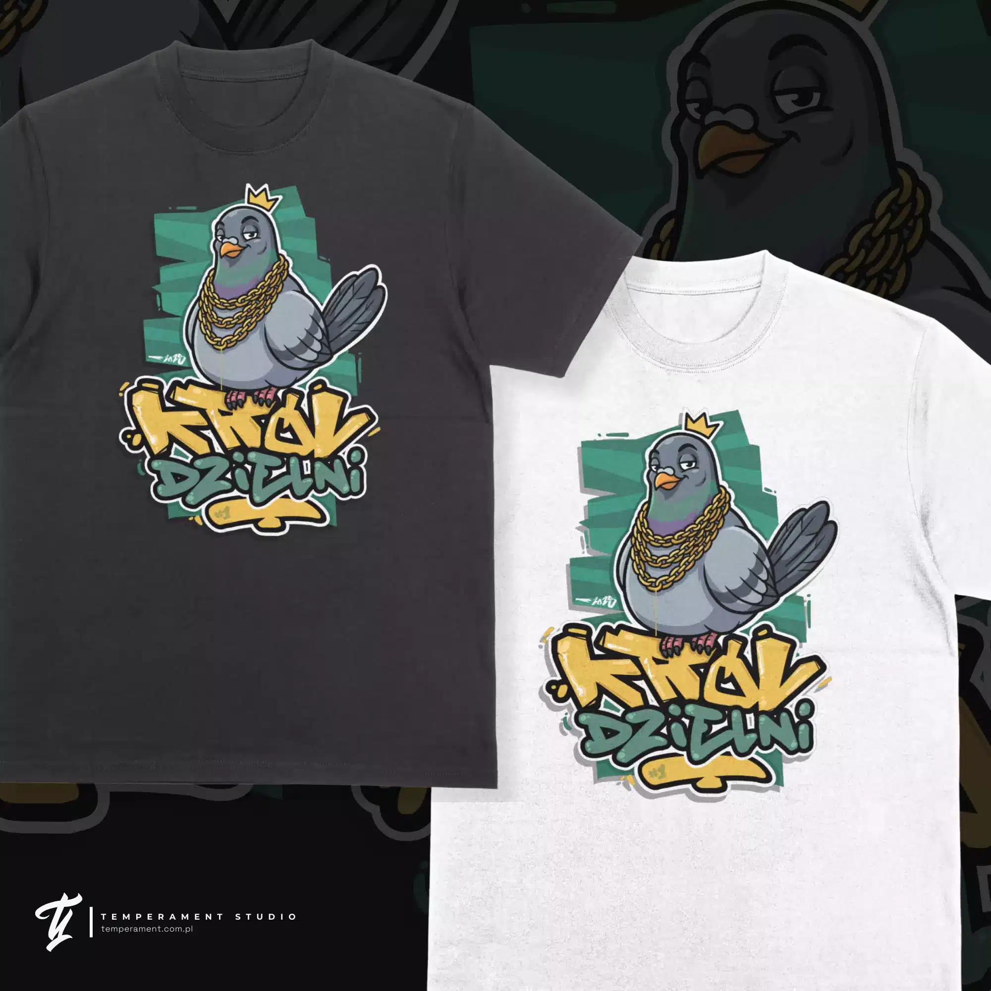 „Król Dzielni” to ilustracja utrzymana w stylistyce urban / street art. Przedstawia charyzmatyczną postać gołębia w złotej koronie i masywnych łańcuchach, siedzącego na graffiti z nazwą projektu. Kolorystyka opiera się na kontraście głębokiej czerni, morskiej zieleni (turkus) oraz wyrazistego złota. Grube, komiksowe kontury sprawiają, że grafika jest niezwykle czytelna nawet z dużej odległości.