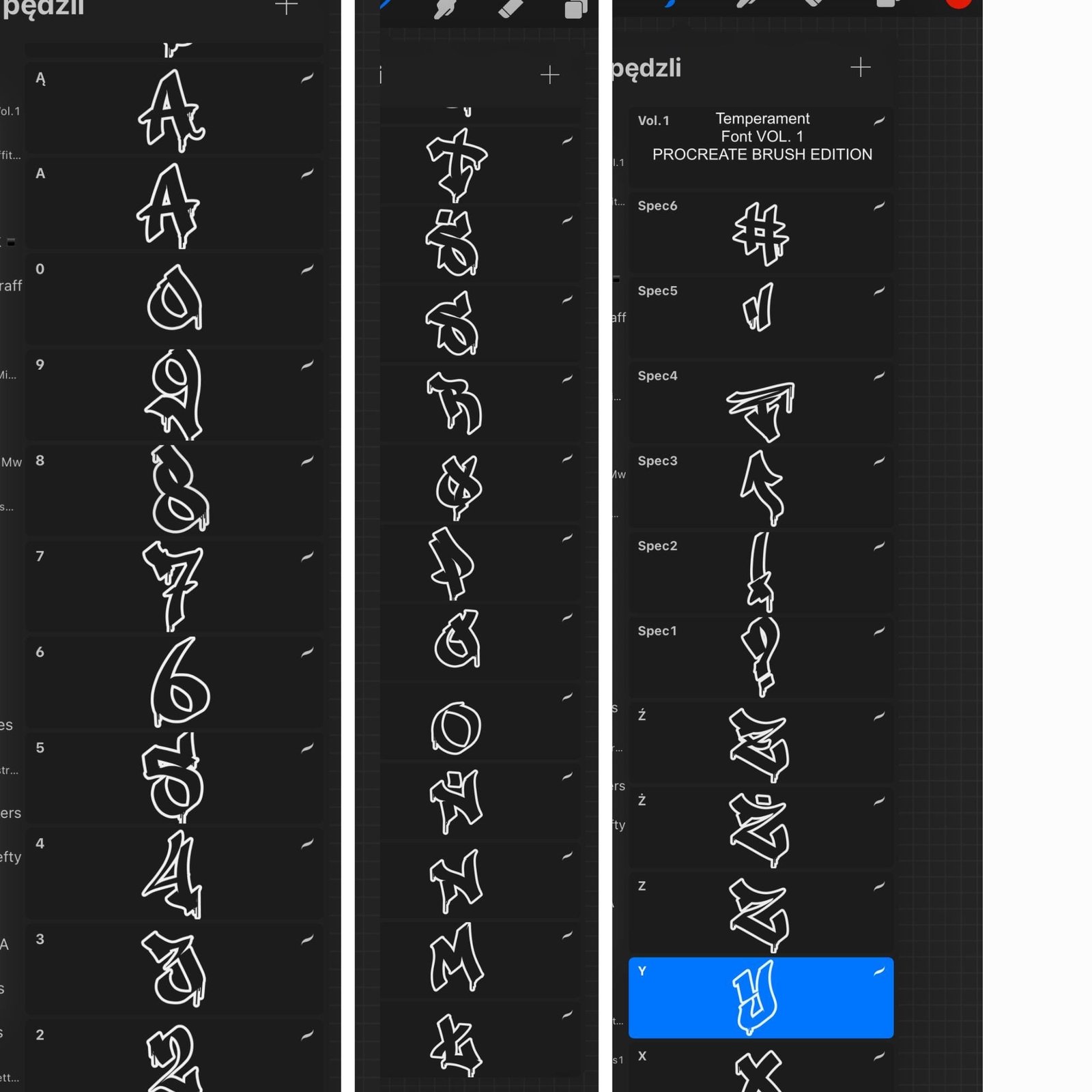 Zestaw 51 pędzli-stempli do Procreate w stylu graffiti, zawierający polskie znaki. Paczka zawiera kompletny alfabet, cyfry i symbole w jednym pliku .brushset do łatwej instalacji. Twórz napisy i kompozycje, stemplując znaki bezpośrednio na swoim iPadzie.
